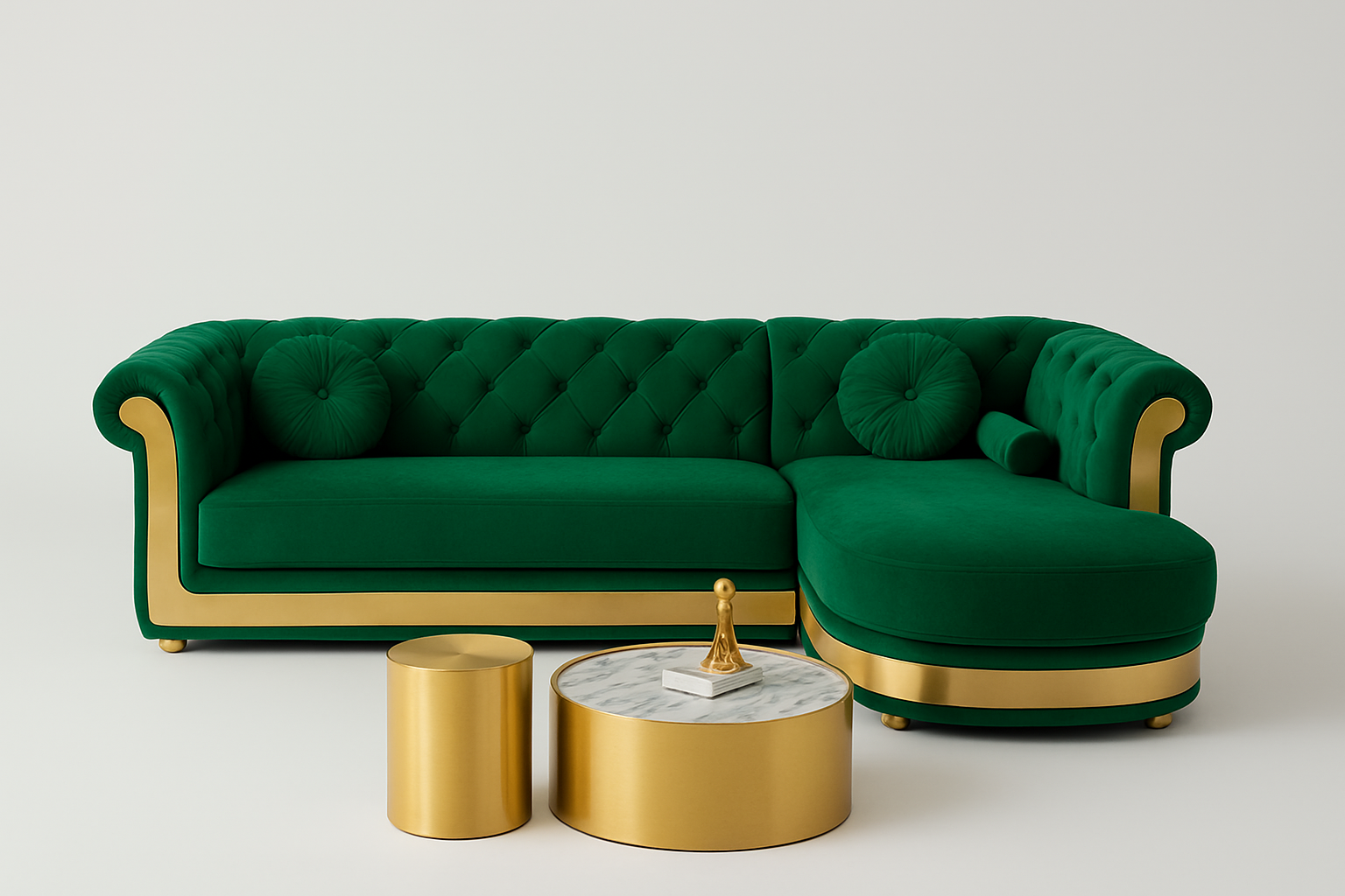 | The Emerald Royale Chaise Sofa is a statement of refined luxury, blending classic Chesterfield elegance with modern glamour. Upholstered in rich emerald green velvet, this sofa features a deeply tufted backrest and gracefully rolled arms that exude timeless sophistication. Polished gold-finish accents along the base and arm panels add a bold, opulent contrast, elevating the overall design. |