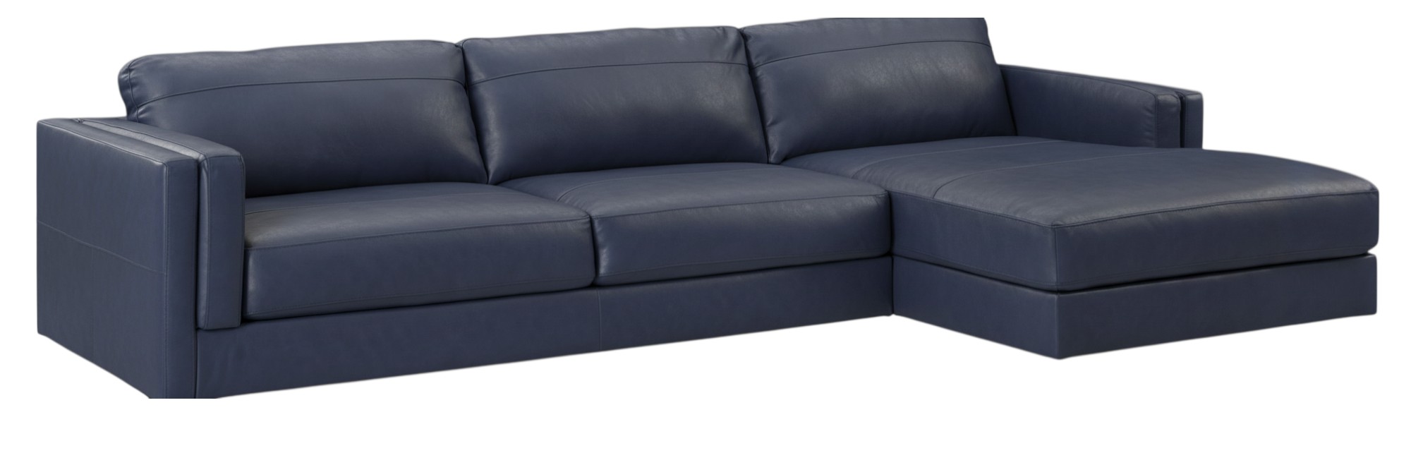 | The Midnight Harbor Chaise Sectional delivers modern sophistication with a bold, streamlined presence. Upholstered in rich navy leather, this L-shaped sectional features clean, architectural lines, wide track arms, and smooth, tailored cushions. The extended chaise invites relaxed lounging, while the low-profile design keeps the look sleek and contemporary. Durable, comfortable, and effortlessly stylish, this sectional is ideal for modern, urban, or minimalist living spaces seeking both function and refined appeal. |